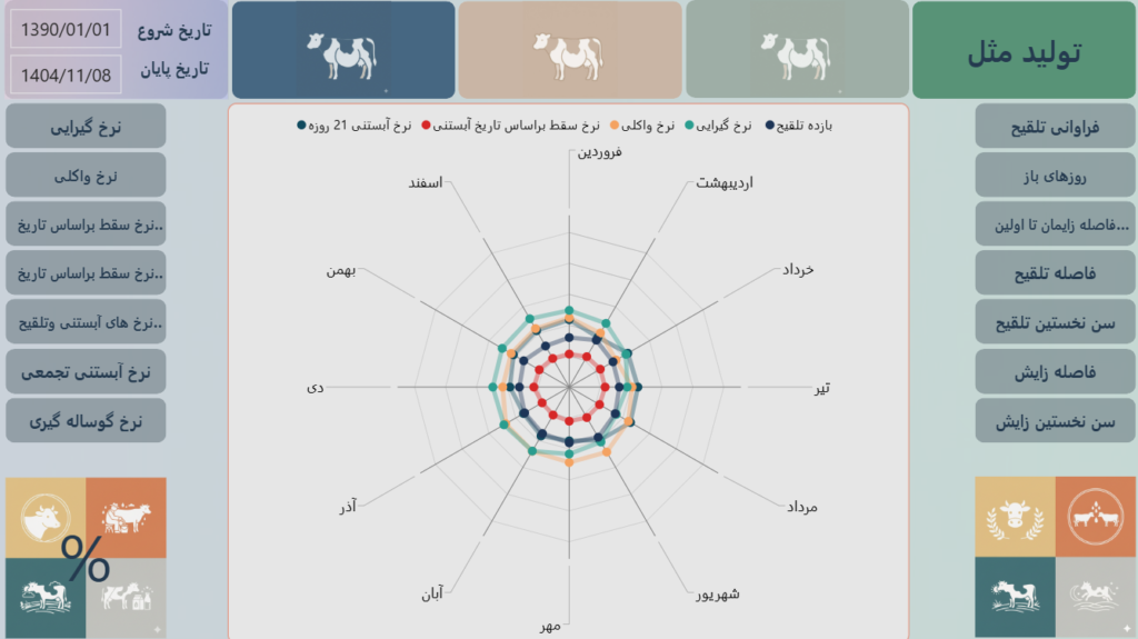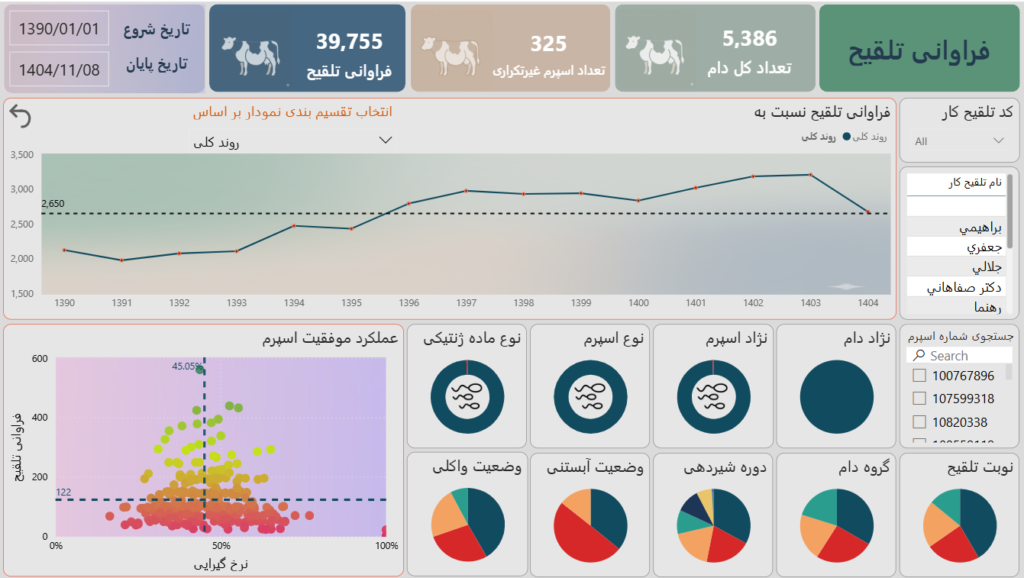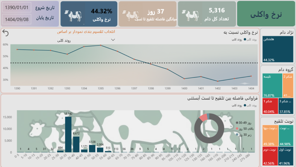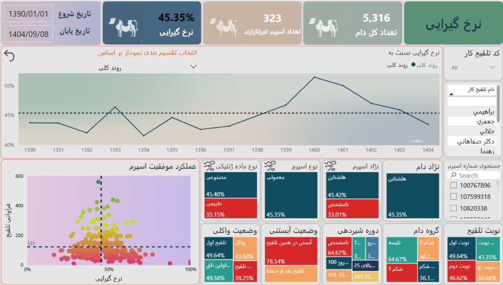 - نمودارهای روند (Trend Analysis): خطوط روند در داشبورد نشان میدهند که طی ماههای گذشته (مثلاً از ۱۴۰۱ تا ۱۴۰۴)، وضعیت تولید مثل بهبود یافته یا deteriorate شده است.